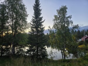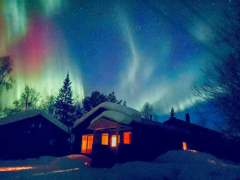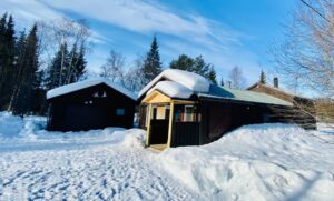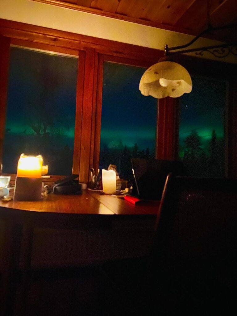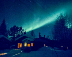 Unser Haus Aurora liegt 600m von der Lodge entfernt, an einem kleinen Sees. Das geräumige Wohnzimmer hat ein grosse Fensterfront um die Sonnenuntergänge oder die Nordlichter zu beobachten. Ein Esstisch eine Sofaecke und ein Kamin, laden zum verweilen ein.